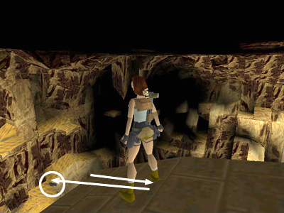 When you've got the positioning right, hop back once (to the spot shown above). Then press Forward then Jump to make Lara take a running jump right at the edge.