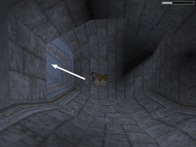 If Lara's air meter is less than half full, return to the open trapdoor for air. Otherwise, after pulling the lever, swim between the pillars on the left and then down into the long tunnel you came through before (as indicated by the arrows in the screenshot above).
