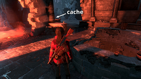 Before moving on, make a few more pickups in this area. If you deciphered the mural earlier, you'll find the last coin cache (3/3) buried just around the corner to the south. (screenshot) Climb the ladder to the ledge where the last enemy was standing to locate the final survival cache (3/3) and a locked strongbox (2/2) containing a BOLT ACTION RIFLE COMPONENT (2/4). (screenshot) You could follow the southern passageway back to the Pantheon Corridor Base Camp or just wait until you reach the next camp. There's no more combat in this level.