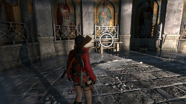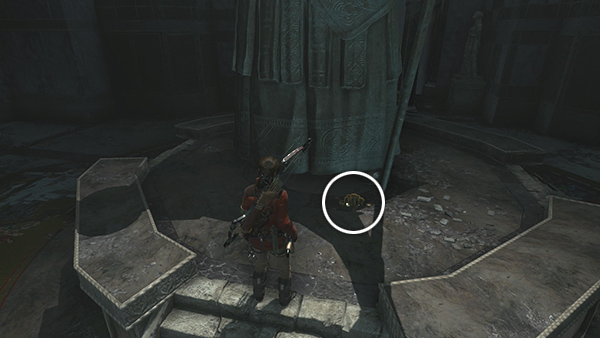 GIANT STATUE OF THE IMMORTAL PROPHET: In a more extensive cutscene, Lara examines the statue and the mosaic inlaid into the floor around it. This mosaic includes a reference to an atlas that she deduces might reveal the location of the Divine Source.