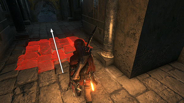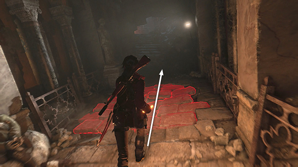 Advance carefully. If you unlocked the Bright Eyes Skill by completing the Red Mines Challenge Tomb, the crumbling floor ahead will glow red, warning of the spike pit below. Jump over this trap to avoid being skewered. (screenshot)