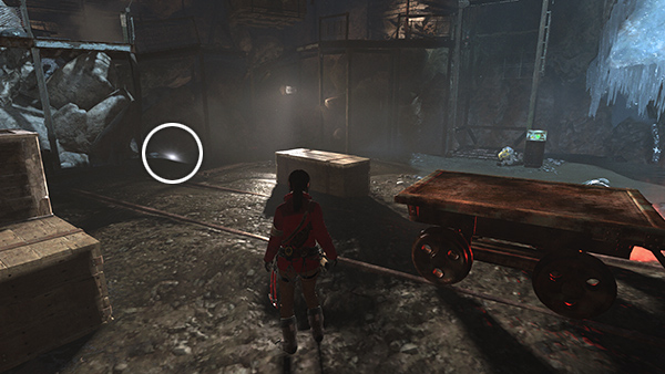Jump down off the ledge and head down the slope past the cart with the winch on it to find a box of supplies near the left wall. Now push the winch cart about halfway down the track so it's lined up with the falling water off to the right. Go around to the other side of the cart and fire a rope arrow into the bucket, attaching it to the winch. Now crank the winch until the bucket is directly beneath the falling water. If it doesn't line up exactly, adjust the position of the cart on the track until it does. The bucket fills with water, becoming heavier until it finally falls into the canyon, dragging the cart with it and breaking open the huge doors. (screenshots)