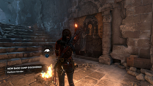 Climb the stairs to the Pantheon Corridor Base Camp. On the wall to the right of the campfire is a mural (1/1), The Prophet's Arrival from the Byzantine Inscriptions series (Greek). (screenshot) There's no fast-travel option from this camp—after all you're trapped in an old mine—but you can rest here and make upgrades. If you have a skill point to spend and don't already have the Brawler skills Thick Skinned, Iron Hide, or Heart of Stone, these are good choices now that combat is starting to get tougher. Fast Healer and Field Medic, which allow you to bandage wounds more quickly, will also come in handy. Resting here also unlocks a document from the Camp Journals II set called Lost.