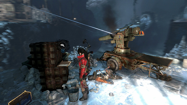 During the mayhem, the second truck that was parked at the top of the slope also slid off the edge, so you can now enter the area behind the wall of ice. Climb onto the wooden ledge and raid the basket of herbs. Then use the rope line to cross the canyon once more and re-enter the ruins on an upper level. (screenshots)