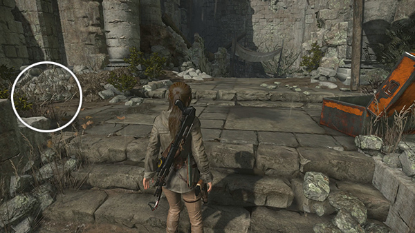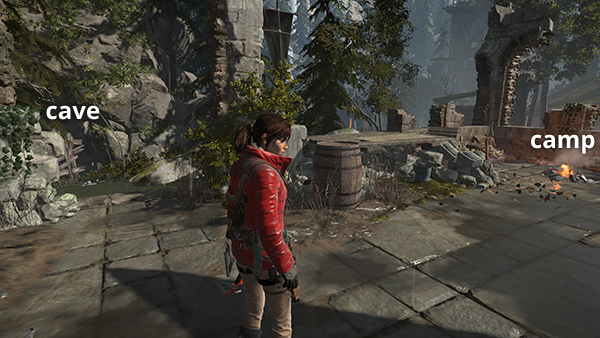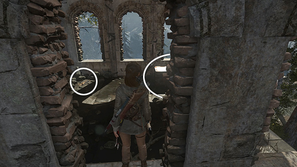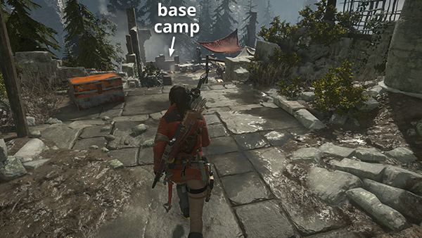 There is another CHALLENGE TOMB ENTRANCE just north of here, but it requires the WIRE SPOOL, which you don't yet have. So for now, head to the south to find the Ruins Encampment Base Camp. There are various minor pickups nearby (arrows, ammo, salvage) and and a box of supplies on the left between the remnant group and the campsite. (screenshot) As you approach the campfire, Jacob contacts Lara over the radio with a mission update. When you rest at the camp, you unlock a document called The Weight from the Camp Journals II series.