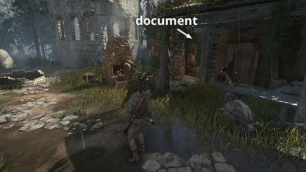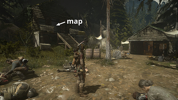 There are a few parts of the village you can't reach yet due to spiked log barriers, fire, and other obstacles. You'll return here later. For now, search the cabins here for collectibles. There's an Archivist Map (4/9), salvage, and shotgun ammo in the building on the left (east) side of the clearing. (screenshot) Examining this map marks the locations of a number of documents on your in-game map.