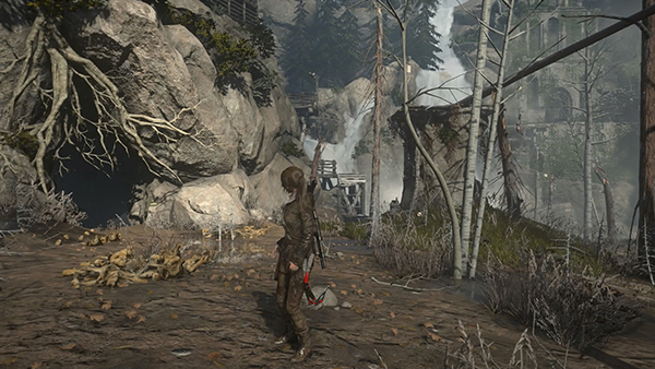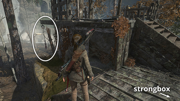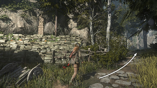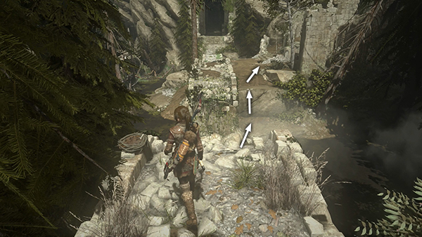 While you're in this area, you can unlock a quick Achievement: For My Next Trick... Hop up onto the tree stump near the blacksmith's forge and then dive into the nearby well. To swan dive, simultaneously press Forward and Jump, then just after takeoff press LT/Right Mouse/L2 to go into a dive. If you do it correctly, Lara will dive head-first into the well, rather than jumping in feet first, and the achievement should unlock. If you're playing with keyboard and mouse, and Lara won't dive when you use the Right Mouse button, try jumping forward and pressing Dodge instead. To get out of the well, use your climbing axes to scale the rough wall. (screenshots)