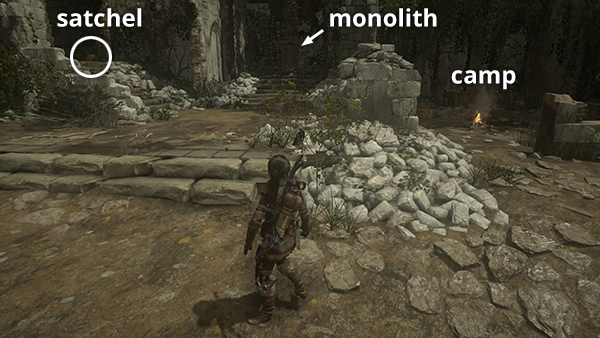 In the ruins near the campfire there's a monolith (2/3) and an Explorer Satchel (4/5). (screenshot) The monolith, inscribed in Greek, reveals 3 coin caches on your map. The satchel provides the locations of several survival caches and a strongbox (or two if you missed the last one). These pickups are all far from here, so we'll go after them later. There's also a salvage crate and feathers near the campfire, a box of cloth in the alcove with the satchel, a hardwood sapling and an herb bush nearby, and more cloth under the bridge.