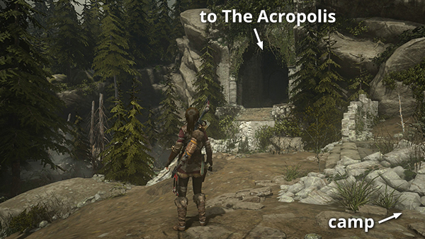 BROKEN BRIDGE AND PATH TO THE ACROPOLIS: Just beyond the strongbox, to the south, is a broken, stone bridge with a bird's nest. Drop down off the end of the bridge and climb up on the far right to find the Aqueduct Ruins Base Camp. (screenshot) If you rest at the fire, Lara will make an entry in the Camp Journals II series called The Dig. This one is especially juicy. ;)