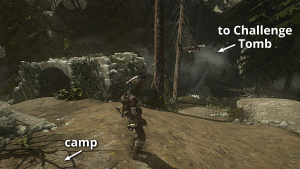CHALLENGE TOMB ENTRANCE: The tunnel that leads to THE ACROPOLIS is at the south end of the broken bridge. (screenshot) But first, let's raid a Challenge Tomb. Move down between the broken bridge sections. Then walk up the fallen tree and jump into the cave opening on the northeast side of the clearing. (screenshot)