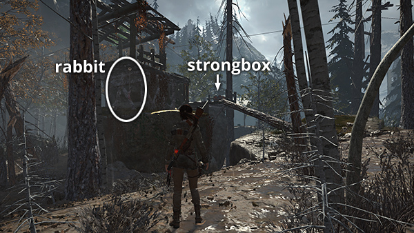 In the muddy clearing just south of the bear cave is a wooden building on top of a stone outcropping. (screenshot) There's a strongbox (3/8) containing a BOLT ACTION RIFLE COMPONENT (4/4) on the wooden deck of the structure (screenshot), some arrows on the upper level, and a snared rabbit (3/6) for the challenge hanging near the southwest corner. (screenshot)