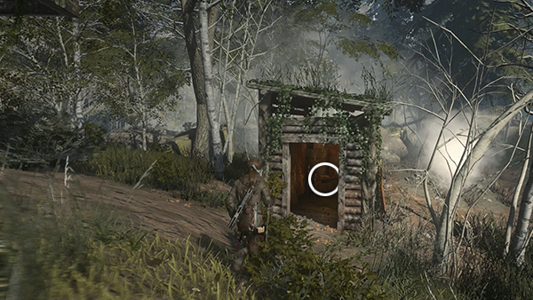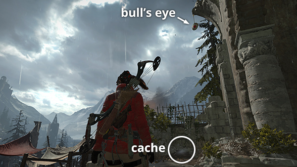 THE ARCHITECT'S CRYPT: To get to the crypt entrance, head up the steep path to the northwest. When you come to a wooden bridge near a small waterfall, get some cloth from the container on the right. Then cross the bridge and climb onto the low ledge ahead. Just before the barricade of pointed logs, move into the sunny clearing on the right. Here you'll find a survival cache (10/20) buried near the rock wall. (The next Explorer Satchel will reveal it on your map, but you can dig it up now.) There's also another bull's-eye (7/8) hanging from a dead tree. Shoot it down for the challenge. (screenshots)