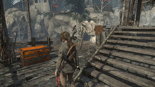 WOODEN CABINS WITH TRINITY SOLDIERS: The new weapon is automatically equipped. Use it to kill 3 Trinity soldiers who emerge from the building ahead. Loot the bodies and grab some herbs from the basket on the porch before entering the building. The next several enemies only appear as you advance, so if you need time to heal, just stay in an area you've already cleared and wait a few moments. As long as you're playing on the easy or medium difficulty setting, Lara's health will regenerate automatically so you won't need to spend resources on bandages. (screenshots)