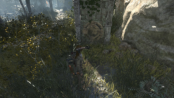 After leaving the crypt, you can return to the Ruins Encampment Base Camp to change weapons and make upgrades if you like. At this point, you can also unlock the Rotisserie Achievement/Trophy. The goal is to shoot a chicken out of the air with a fire arrow, but thanks to a minor glitch, it's much easier than it sounds. Equip the bow and select fire arrows. Then grab one of the chickens that tend to flock around this campsite. Drop the chicken (C/Circle/B) and while it's flapping around, quickly shoot it with a fire arrow. The achievement/trophy should unlock. (Thanks to Tomb Raider Discord for this helpful tip!)