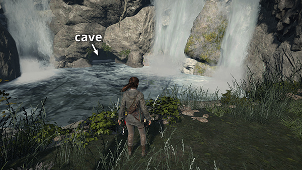 NOTE: There's an underwater cave entrance at the base of the waterfall (C3 on the map), but you'll need the REBREATHER to enter. (screenshot) I'll remind you to do this later in the game.