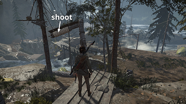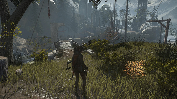 EXPLORING THE LOWER VALLEY - MUD FLATS BELOW THE GUARD TOWER: When you slide down to the valley floor either before or after raiding the House of the Afflicted Challenge Tomb, Jacob contacts Lara by walkie talkie. He apologizes for Sofia's hostility and suggests that Lara pitch in with the battle preparations in order to earn his people's trust. While he's talking, look for another snared rabbit (2/6) strung up just ahead and cut it down for the challenge. (screenshot)