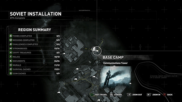 NOTE ON BYZANTINE COINS AND THE SUPPLY SHACK: I highly recommend saving your coins and purchasing the GRENADE LAUNCHER attachment for the rifle. It will be especially helpful in one particular fight in the later part of this level. The launcher cost 120 coins at the SUPPLY SHACK. To get back there, go to any base camp, select Fast Travel, and then choose the Communications Tower Base Camp in the Soviet Installation on your map. (screenshot) After making your purchases, use the Communications Tower camp to fast travel back to where you left off. Later you'll unlock the Grenadier skill, which will allow you to craft ammo for the grenade launcher.