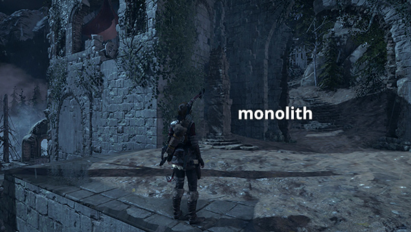 Fast travel back to the Ruins Encampment Base Camp. From there, head up the hill to the east to find the monolith (3/3). You probably spotted it earlier on the way to the first big fight with Trinity. (screenshot) Read it to reveal the locations of 3 more coin caches on your map. One is near the second guard tower and the Remnant hunter's cabin on the lakeshore. We'll go after it soon. The other two are in areas that you can't reach yet.