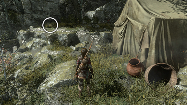 Drop down into the room on the left to discover a cache of grenades and unlock a new ammunition type: GRENADE ARROWS. You'll also find all the supplies you need to make your own grenade arrows (arrows, cloth, and magnesite), as well as an oil can and a relic (2/3), a carved Deer Charm from the The Early Inhabitants set. (screenshot)