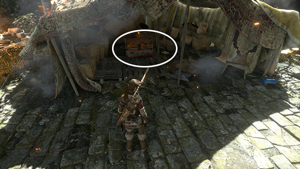 RUINED BAZAAR: Lara says she hopes she's not too late to help, but of course game time is fluid, so you can explore at your leisure without worrying too much about your Remnant friends. There are various minor pickups in this area including lots of hardwood and herbs, some magnesite, an oil can, and ammo for various weapons. On the hillside behind the campsite, next to an olive green tent, is a locked strongbox (1/3) containing a FULL-AUTO SHOTGUN PIECE (1/4). (screenshot) There is also a survival cache (1/3) buried on the rock ledge just north of this tent. You can locate it by its telltale flash if you want to dig it up now. (screenshot) Otherwise, wait until you find the Explorer Satchel that reveals it on your map.