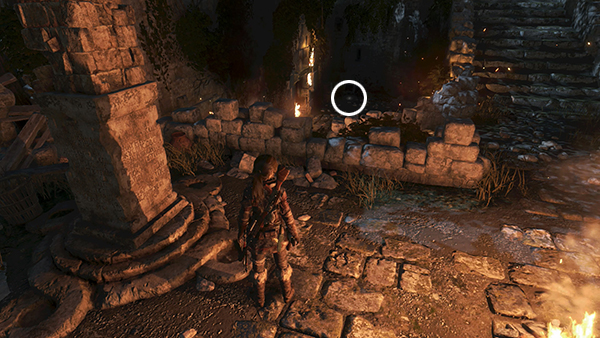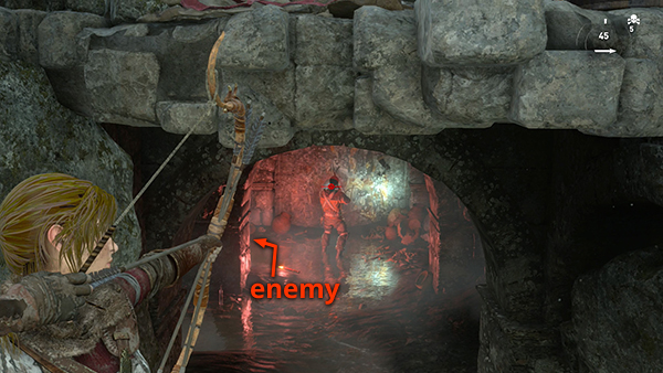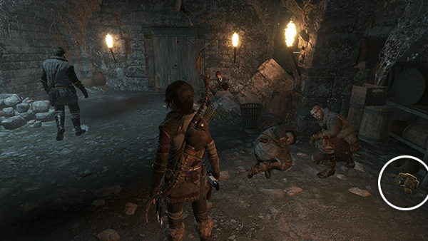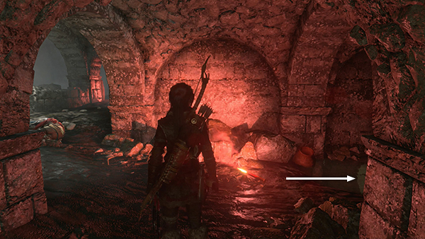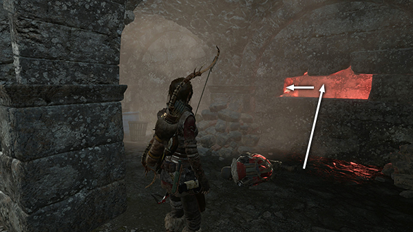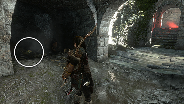 BASEMENT ROOM WITH SANDBAGS: As you advance toward the light, an explosion destroys the floor, dropping Lara into the room below. While you gather your wits, 2 more enemies wander in from the right. Stay hidden behind the wall of sandbags so they don't notice Lara. (screenshot) Then use a poison arrow or make a molotov cocktail from one of the nearby bottles to kill them both. Or, shoot an arrow into the wall directly ahead of the sandbags to draw one of the men away. Then take him down with a silent headshot, and do the same with his buddy. In addition to whatever items the men were carrying, there are mushrooms growing in the northeast corner, plus cloth and more mushrooms in the alcove to the southwest. When you're ready to move on, go through the raised opening in the southeast and follow the passageway to the left. (screenshot)
