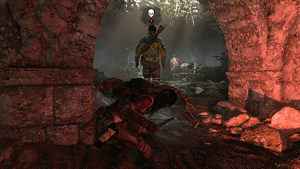 FIGHTING YOUR WAY TO THE ACROPOLIS TOWER: Lara arrives on the scene to find her Remnant allies under fire. The portcullis closes behind you preventing retreat. As far as I can tell, there's no way to sneak your way through this encounter, so you'll need to be aggressive. You may be able to take out one or two of the Trinity soldiers from inside the archway, but they soon spot Lara and start shooting. So run forward and take cover behind one of the boxes. Kill the first man on the left if you didn't hit him from the doorway. Then attend to the 2 soldiers ahead on the right. You can probably kill them both with one poison arrow, especially if you've unlocked the Death Cloud Arrows skill, which makes your poison arrows even more toxic. Same with the next 2 men who appear on the ledge above. If one of them manages to throw a grenade, quickly move out of the way and take cover behind another box, the big rock in the middle of the street, or one of the stone columns on the right. There's one more guy on the far left, assuming he didn't succumb to your toxic cloud earlier. Kill him with your weapon of choice, and this phase of the fight is over. (screenshots)