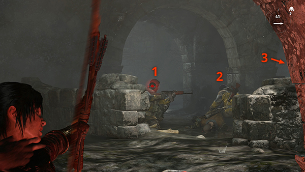 There are 4 more enemies around the next corner. They appear in pairs beneath the archway at the top of the steps. Again, poison arrows work well for clustered enemies at a distance, but the rifle is fine too. If any of them rush you, switch to the shotgun for a fast, close-quarters takedown. There's one more man inside the ruined building with the arches. Advance to a position just behind the low wall to get his attention. Then try to take him out quickly, but be prepared to run back down the stairs if he starts throwing grenades. (screenshots)