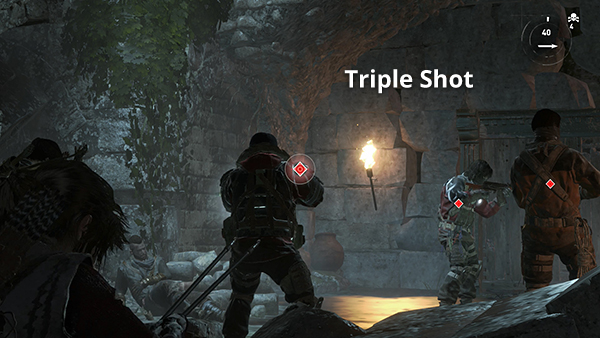 NOTE: To use Double or Triple Shot once you've unlocked the skill, hold LT/Right Mouse/L2 to draw your bow as usual, aim and then zoom in by clicking the right stick or pressing Z on the keyboard. Hold RT/Left Mouse/R2 to charge your shot. The targeting reticle will turn into a red diamond indicating the first target is locked. Sweep the right stick or mouse to target a second enemy, then a third if you have Triple Shot. Finally release RT/Left Mouse/R2 to fire, hitting multiple targets. Once you have the third-tier skill True Shot, the locked targets automatically become headshots, making the bow one of your most powerful weapons.