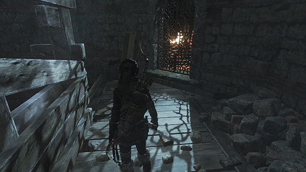 Scramble up the wooden wall opposite the mural. From here you can see the blocked door to the catacombs through an ornate, metal grate. (screenshot)