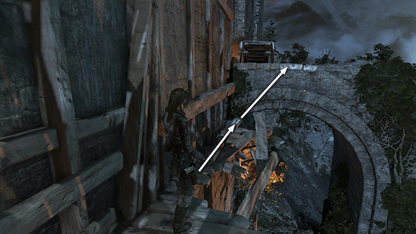 Continue up the steps and walk across the planks to the wooden ledge that runs along the front of the next building. In the left corner, lying near an abandoned bedroll, is a document (6/10), Language of the Land from the Codex of Survival series (Greek). (screenshot) Move along the wooden ledge, sidestepping carefully to the end. Then jump to grab the edge of the stone bridge and pull up. (screenshot)