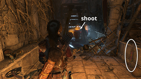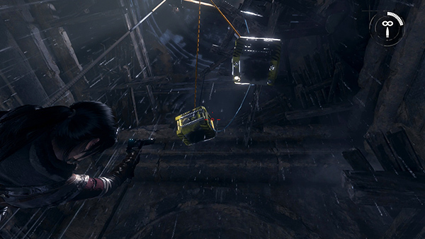 When you regain control, Lara and Ana are tethered together. Ana is clinging to a wooden beam, with Lara suspended below. A pair of heavy generators are attached to Ana's foot by a second rope. Lara still has her pistol out, but in order to get free you must shoot each of the generators several times in order to destroy them before the beam collapses. (screenshot)