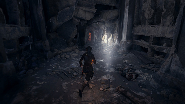 Run forward, jump off the red painted ledge, and then grapple-swing across the gap onto the balcony with the burning tree roots directly ahead. Keep running forward toward the end of this balcony as the Deathless archers explode the Greek fire vessels behind you. Jump off the next red painted ledge toward the archway ahead. The ledge collapses as Lara grabs it, dropping her into the tunnel below. Steer around obstacles as you slide down into the next area. (screenshots)