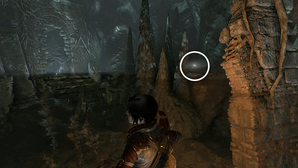 TUNNEL TO THE SURFACE: Wade out of the water and look up to the right. There's a side passage there, but you can't reach it yet. Later, when you've unlocked BROADHEAD CLIMBING ARROWS, you'll be able to shoot them into the rough wooden wall and use them to climb up. (screenshot) There's a mural (3/3) at the end of that passage.
