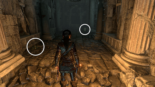 You'll need to find more Greek fire and use it to bring down the statue in order to reach the exit, but first let's do some exploring. It doesn't really matter which side of the ruins you explore first, since you'll need to visit both eventually. So let's start on the north side, where you came in.