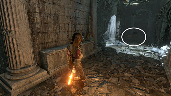 You can go back the way you came, but fortunately you don't have to. Instead, drop down through the opening in the floor. Pick up some supplies here. Then shoot the Greek fire container to blow out the door and return across the pool to the Greek Fire Depot Base Camp. If you missed any of the other collectibles in this area, get them now. Then use the camp to fast travel back to wherever you left off. from which you can fast travel back to wherever you left off. (screenshots)