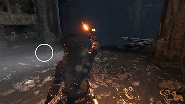 Continue straight ahead past the opening where you climbed up. At the bottom of the short flight of stairs, turn left. Continue to the next open doorway on the right. Drop down into a dark area with a wooden floor. (This is the upper level of the room where you found the survival cache and coins earlier.) Move to the right, toward the back of the room. Grab some herbs from a jar, jump over the hole in the floor, and head to the left. Then climb into the opening above on the right. (screenshots)