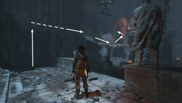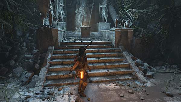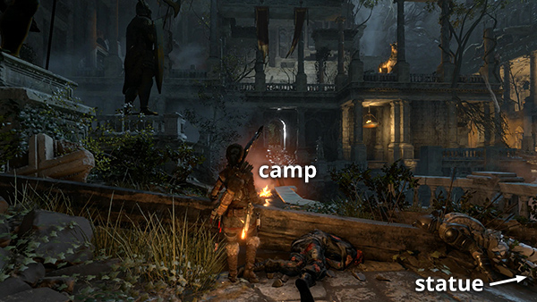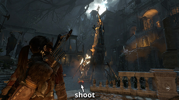 During the cutscene, the giant statue topples over, creating a ramp leading up to the exit. As Lara climbs out of the pool, a squad of Deathless archers launches a volley of flaming arrows from the building to the east.