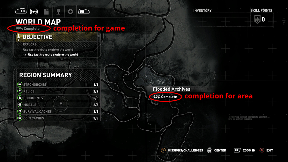 Open the in-game map by pressing Tab on the keyboard or View/Back on a controller. Then use the direction keys or left stick to examine the various areas on the world map. As you hover over each area, you'll see the percentage completion and Region Summary on the left side of the screen. (screenshot) When you find a region where you are missing something, zoom in to see more detail. You may be able to see the missing items on your map. (screenshot)