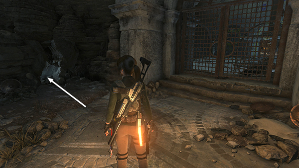 HILLSIDE PATH LINED WITH SPEARS: There are no major pickups in this area, but do take a moment to enjoy the view as you follow the twisting path down to the ruins. At the bottom, you can see the Orrery through a grated window, but you can't get in that way. Instead squeeze through the opening in the rocks on the left (screenshot) and climb/jump down a series of ledges to reach the entrance to the Orrery proper.