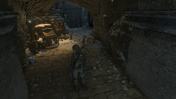CODEX ROOM AND PASSAGE TO THE EXIT: Examine the codex to unlock the Classically Trained skill, which enhances Lara's rapid-fire archery skill. You'll also find a lump of ore, a box of supplies, a container of cloth, and a stack of gold coins arranged around the lectern. (screenshot)