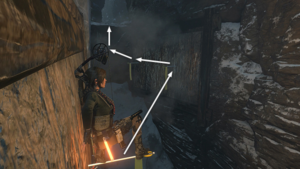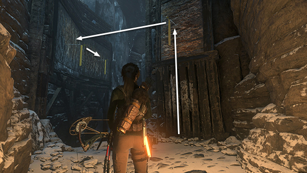 Climb back up and shoot one climbing arrow into the soft wood panel above on the right. Then shoot two more into the wall on the left. Scramble up the wall to perch on top of the first arrow. Jump across the gap to the second arrow then the third. (screenshot) While crouching on the third arrow, shoot two more into the wall on the other side of the tunnel. Jump onto the first arrow, then the second, and from there jump toward the stone wall and scramble onto the ledge above. (screenshot) Follow the passageway into the next level.