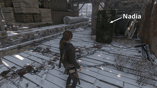 When you've defeated the wolves, the witch reappears and chases Lara off the cliff ledge into the river below. Be thankful for cold water for once, since this seems to snap Lara out of her hallucination. She surfaces in a narrow canyon with falling water and a series of rusty metal tanks and pipes. After a brief conversation with Nadia over the radio, you now have a new goal.