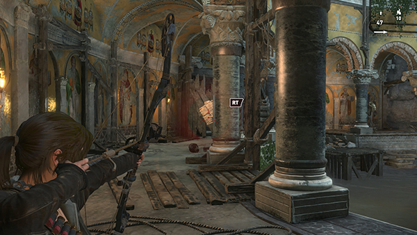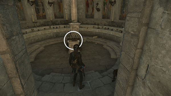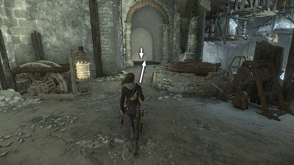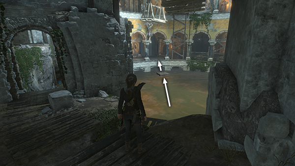Go around to the far left corner of the pool (there are arrows here if you need them), and then jump across the raised platforms to the ledge on the far right. You'll find more arrows leaning against the wall behind a second winch. Before doing anything with that, jump up onto the stone wall that juts out beside the winch. Go around behind the wall to find a document (12/21), The Gulag Burns from Nadia's Grandfather's Journal (Russian) Climb back down to the second winch. Stand beside it and shoot a rope arrow into the second spool directly across the pool from here. This will allow you to raise the third platform, next to the spool, but don't bother doing that yet. (screenshots)