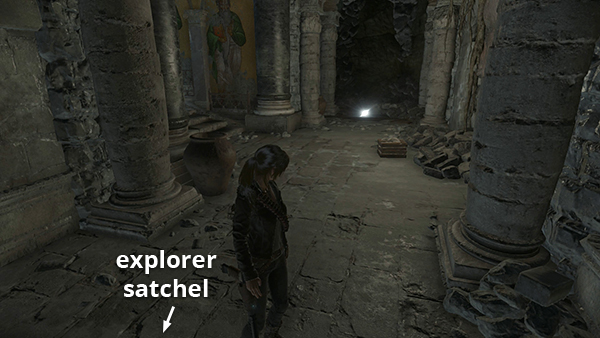 Pick up the ammo but ignore the ladder leading up to the next level for now. Instead, go through the doorway to the south into the big room where you fought the witch. Jump into the pool, swim across to the floating pallet on the west side, and climb out there. (screenshot) Go through the doorway directly ahead into a dead-end passageway. Inside on the right is the Explorer Satchel (1/1). (screenshot) On the left, opposite the satchel, is one of those survival caches (4/6). (screenshot)
