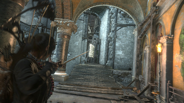 Dive into the pool and climb out on the ledge where you started. Press the Melee button to cut the rope anchoring the platforms to the post. (NOTE: If you have not yet unlocked the Combat Knife, you can just skip this step.) Then run another rope line from the first winch to the large spool above the 2 platforms, just as you did before. Crank the winch again to move the platforms. Move back to the post on the right, wait for the platforms to move so the one on the left is slightly higher than the one on the right, and then shoot a rope arrow into the large spool to anchor the platforms in place. (screenshots)