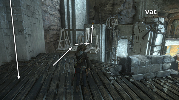Since you've already used this vat, it no longer works, but you will need to fight 2 more archers and 3 swordsmen before you can move on. There are several stone blocks you can use for cover, in addition to the vat and lever. Just watch out for the hole in the floor on the upper ledge. When you've taken care of these enemies, loot their packs, climb onto the elevated wooden walkway, and follow it to the upper end. (This walkway is shown on the level map running from the east wall out toward the middle of the room.) (screenshots)