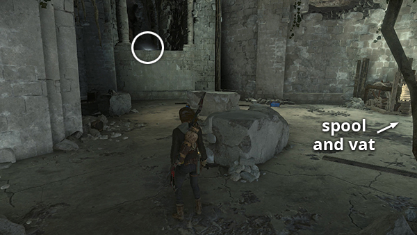 Now head past the fifth spool and vat (E on the map) to the doorway at the north end of the walkway. (screenshot) Drop down into the room below to find the Archivist Map (1/1) for this area. (screenshot) You won't need it if you followed this walkthrough, since it will be your last pickup. Use a rope arrow to pull down the barrier and go through to emerge near the third vat (C on the map). If you're done exploring, you can drop through the hole in the floor behind the vat to get back to the round room where you found the relic. (screenshot)