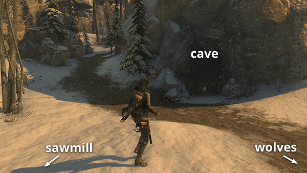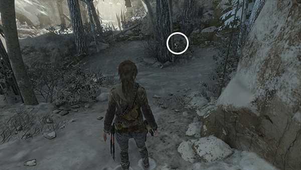 ENTERING THE VALE (WITH THE ANTIDOTE): Head up the steps near the campsite and squeeze through the opening into the vale. This time Lara has come prepared, so there are no hallucinations. Follow the canyon down past the rows of creepy skeletons. As you emerge into the forest, head to the right to find a survival cache (1/6) buried near the curve in the west side of the path. (screenshot) Use the flash to help find it, check the annotated map, or wait until you've found the Explorer Satchel later on and the cache will be marked on your map.