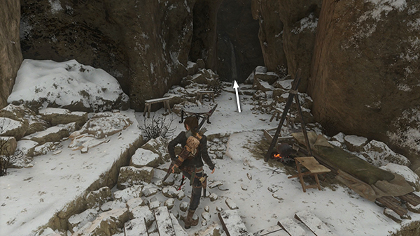 Enter the cave and go through the gate at the back of it. Then follow the passageway to the Frozen Gorge Base Camp. This will be familiar if you raided the Voice of God Challenge Tomb earlier. If not, you can combine both quests now. Squeeze through the opening in the rocks beyond the campfire and head to the left. Climb along the canyon to the tomb entrance. If this is your first time, you can check the Challenge Tomb walkthrough for details.