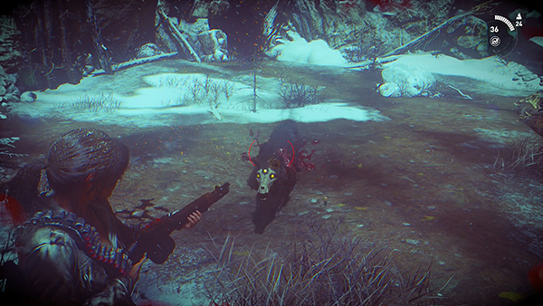 In a short cutscene, the witch appears in her walking house, just like Nadia described, and begins hurling fireballs. The ledge on which Lara is standing collapses, dropping her into the quarry. The witch then tosses a final fireball into the pit, opening the entrance for a pack of demonic wolves. (The exact number appears to be random.) Fight them as you would regular wolves, using poison arrows when there are several at a distance. (screenshot) Then switch to the shotgun when they charge. (screenshot)